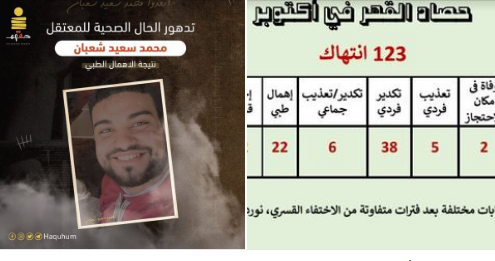 رصد أرشيف القهر لشهر أكتوبر المنقضي الصادر عن “مركز النديم لمناهضة العنف والتعذيب” 123 انتهاكا متنوعا وظهور 183 من المختفين قسريا لفترات متفاوتة أثناء عرضهم على عدد من النيابات المختلفة . الانتهاكات شملت قتل ووفاة 2 داخل مقار الاحتجاز نتيجة الإهمال الطبي و22 حالة إهمال طبي و5 حالات تعذيب فردي و38 حالة تكدير فردي و6 حالات تكدير جماعي و42 حالة إخفاء قسري و6 حالات عنف دولة.