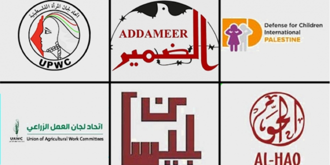 والمنظمات الفلسطينية الخمس هي: مجموعة حقوق سجناء الضمير ؛ جماعة الحق الحقوقية ؛ واتحاد لجان المرأة الفلسطينية ؛ ومركز بيسان للبحث والتطوير ؛ واتحاد المرأة والطفل والسادس هو فرع فلسطين من منظمة الدفاع عن الأطفال الدولية ومقرها جنيف.