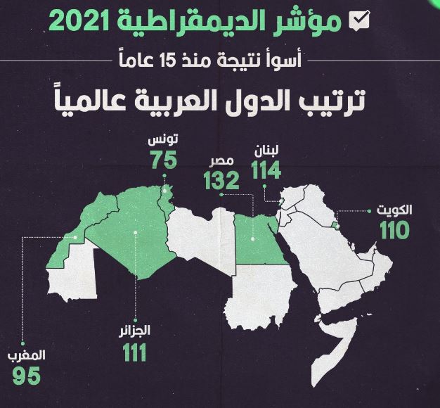 سجلت مصر المرتبة 132 خلال 2021 في مؤشر الديمقراطية العالمي، متأخرة عن ترتيبها 103 في 2014، ودرجتها بين 180 دولة على مستوى العالم ، كما سجلت منطقة العالم العربي أدنى المراتب واحتلت خمس دول عربية وهي سوريا، اليمن، ليبيا، السعودية، السودان والبحرين أسوأ مستويات التصنيف للديمقراطية وضمن تصنيف النظام السلطوي الاستبدادي.