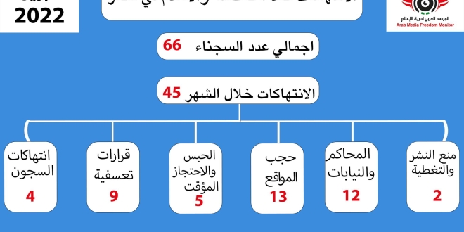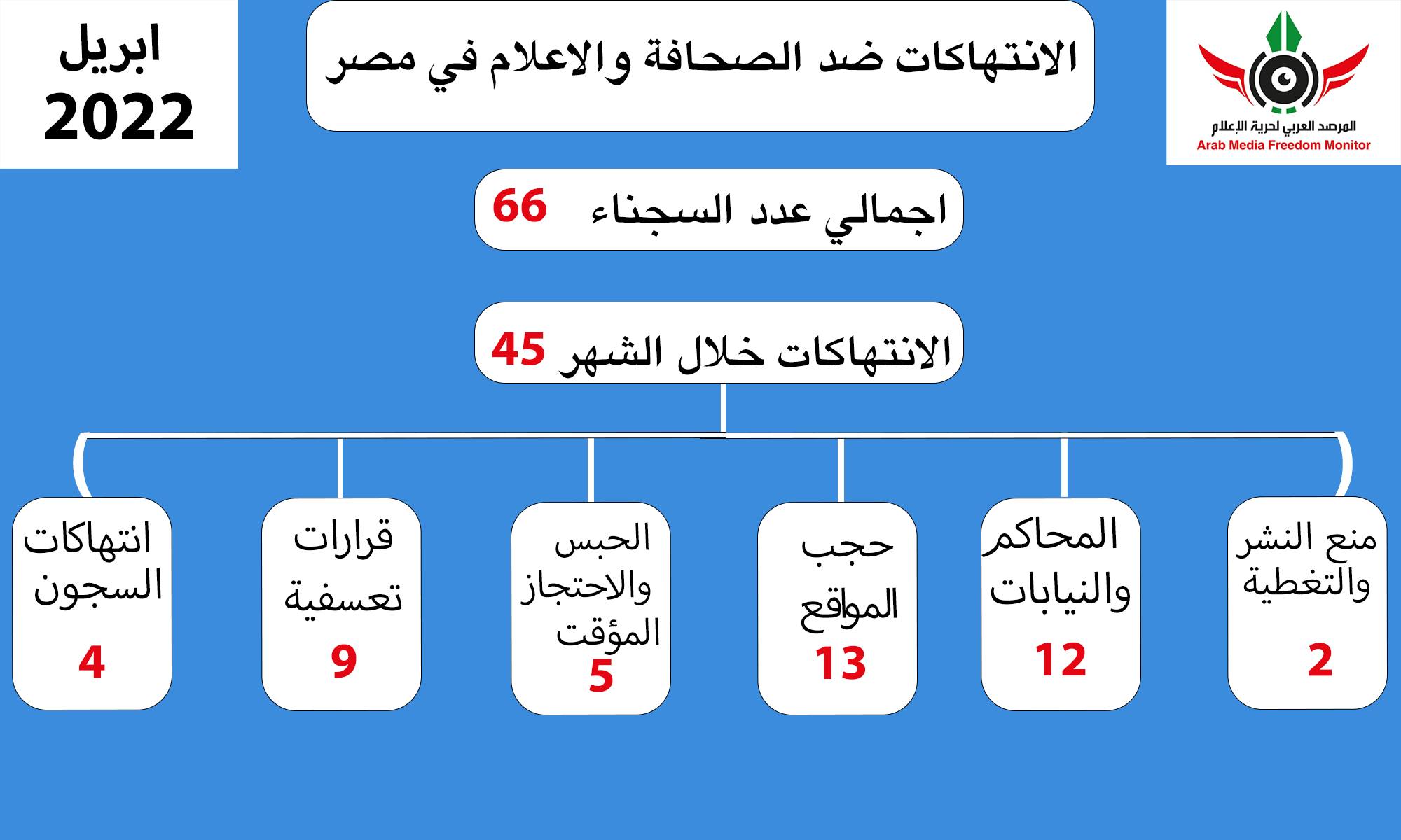 ووثق المرصد في تقريره انتهاكات حرية الإعلام في مصر عن شهر إبريل المنقضي 45 انتهاكا متنوعا واستمرار حبس 66 صحفيا وإعلاميا بما يؤكد استمرار سلطات الانقلاب في تكبيل الحريات وإغلاق المجال العام.