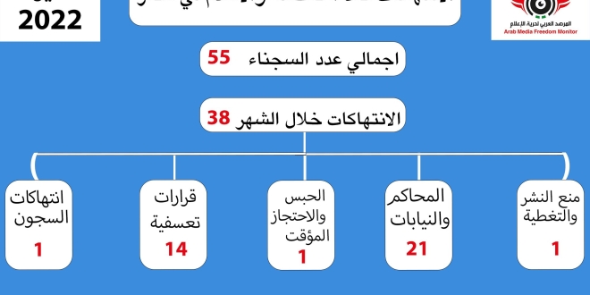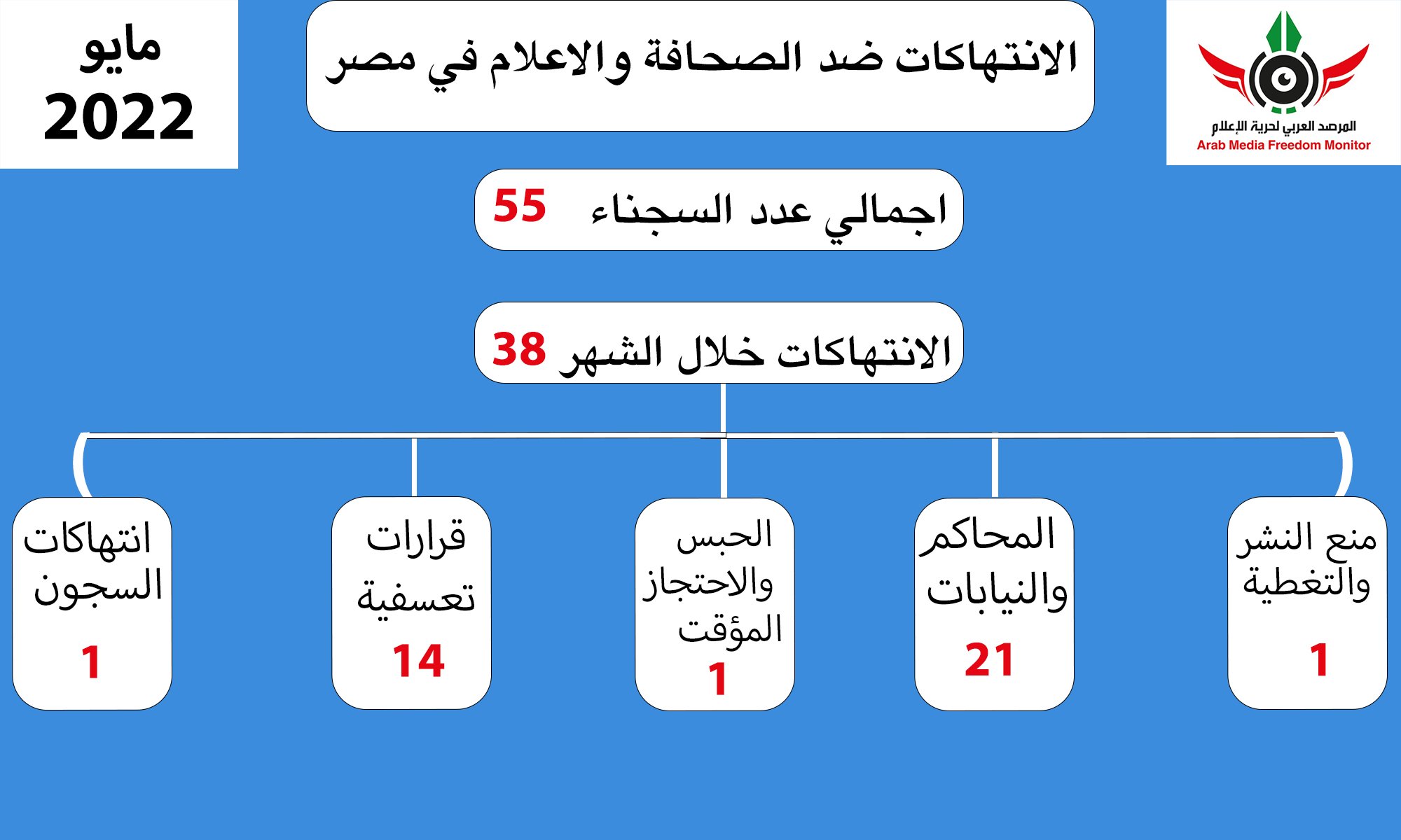 وثق المرصد العربي لحرية الاعلام 38 انتهاكات خلال شهر مايو  المنقضى بما يعكس تواصل وتصاعد الانتهاكات بحق حرية الصحافة حيث تراجعت مصر إلى المركز 168 عالميا لعام ٢٠٢٢، لتستمر في المنطقة السوداء من بين ١٨٠ دولة حول العالم.