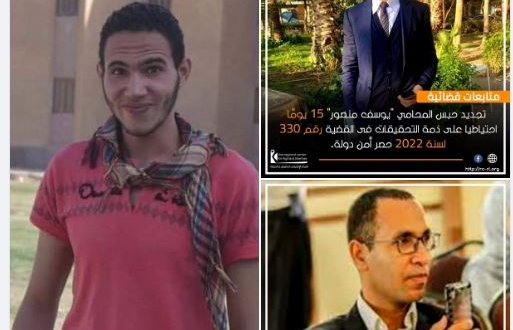 فيما وثق المركز الإقليمي للحقوق والحريات تجديد حبس المحامي "يوسف منصور" 15 يوما احتياطيا على ذمة التحقيقات في القضية رقم 330لسنة 2022 والصحفي "مصطفى الخطيب" 45 يوما، على ذمة التحقيقات في القضية رقم 488 لسنة 2019 باتهامات مسيسة تزعم الانضمام لجماعة محظورة ونشر أخبار كاذبة .