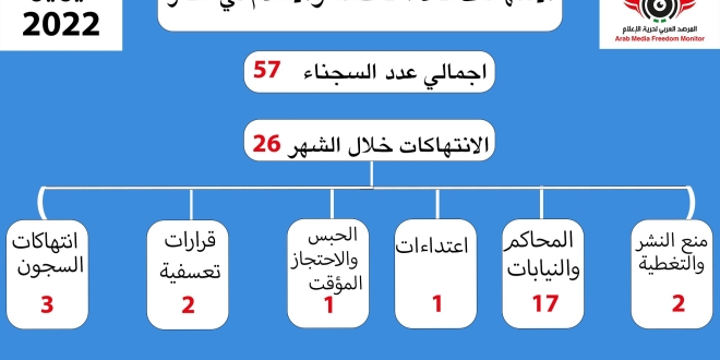 وثق المرصد العربي لحرية الإعلام 26 انتهاكا متنوعا في تقريره عن انتهاكات حرية الإعلام في مصر خلال يونيو 2022 واستمرار حبس 57 صحفيا وصحفية مع نهاية يونيوالمنقضي ، بما يعكس تواصل سياسات القمع والانتهاكات لحرية الإعلام .