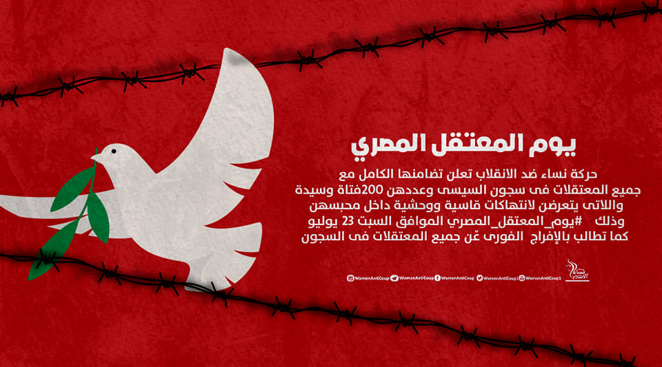 أعلنت حركة نساء ضد الانقلاب عن تضامنها مع جميع المعتقلات في سجون السيسي وعددهن 200 فتاة وسيدة بالتزامن مع يوم المعتقل الذي أطلقته رابطة شباب المعتقلين مؤخرا ، والذي يوافق السبت 23 يوليو الجاري .