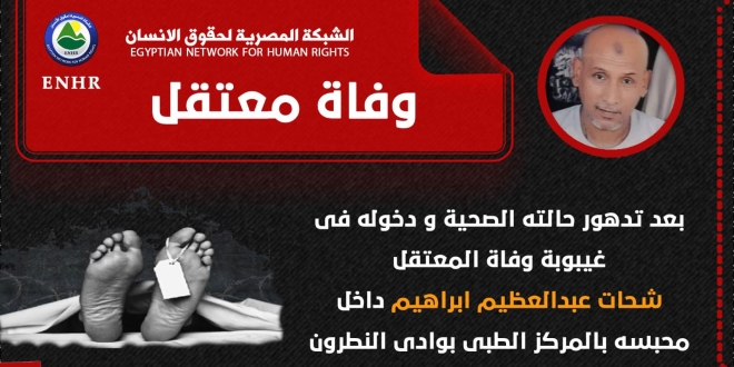 وثقت الشبكة المصرية لحقوق الإنسان استشهاد المعتقل "شحات عبد العظيم إبراهيم" من مدينة إدفو محافظة أسوان، نتيجة لما تعرض له من إهمال طبي داخل محبسه وعدم حصوله على حقه في العلاج والرعاية الطبية المناسبة داخل سجن وادي النطرون .