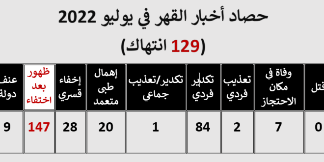رصد أرشيف القهر لشهر يوليو المنقضي 2022 الصادر عن مركز النديم لمناهضة العنف والتعذيب 129 انتهاكا متنوعا وظهور 147 من المختفين قسريا لفترات متفاوتة أثناء عرضهم على نيابة أمن الدولة العليا.