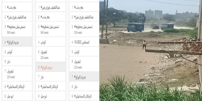 تصدر هاشتاج #جزيرة_الوراق موقع التواصل الاجتماعي للتغريدات القصيرة "تويتر" مع مشاهد جديدة لمنع مظاهرات أهالي الوراق الرافضة للتفريط ببيوتهم وأراضيهم الزراعية لصالح مشروعات إماراتية داخل مصر.