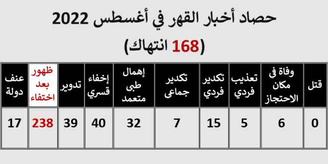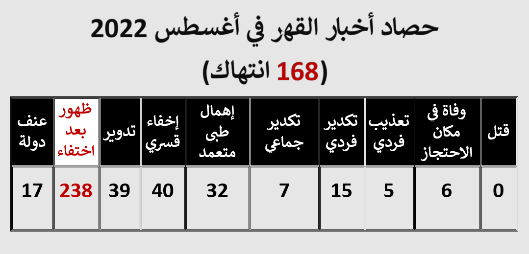 رصد أرشيف القهر لشهر أغسطس المنقضي 2022  الصادر عن مركز النديم لمناهضة العنف والتعذيب 168 انتهاكا متنوعا ، وظهور 238 من المختفين قسريا لفترات متفاوتة أثناء عرضهم على نيابة أمن الانقلاب العليا.