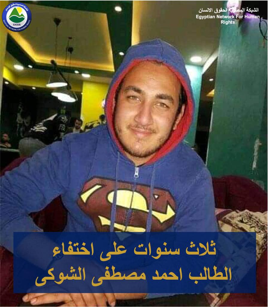 فيما ثقت الشبكة المصرية لحقوق الإنسان اختفاء الطالب ” أحمد مصطفى حسن الشوكي ” 23 عاما الطالب بالفرقة الثانية بالمعهد العالي للغات والترجمة بالجيزة ، وذلك بعد اعتقاله مساء يوم 8 أبريل 2019 وانقطاع كل سبل التواصل معه وإغلاق تليفونه المحمول.