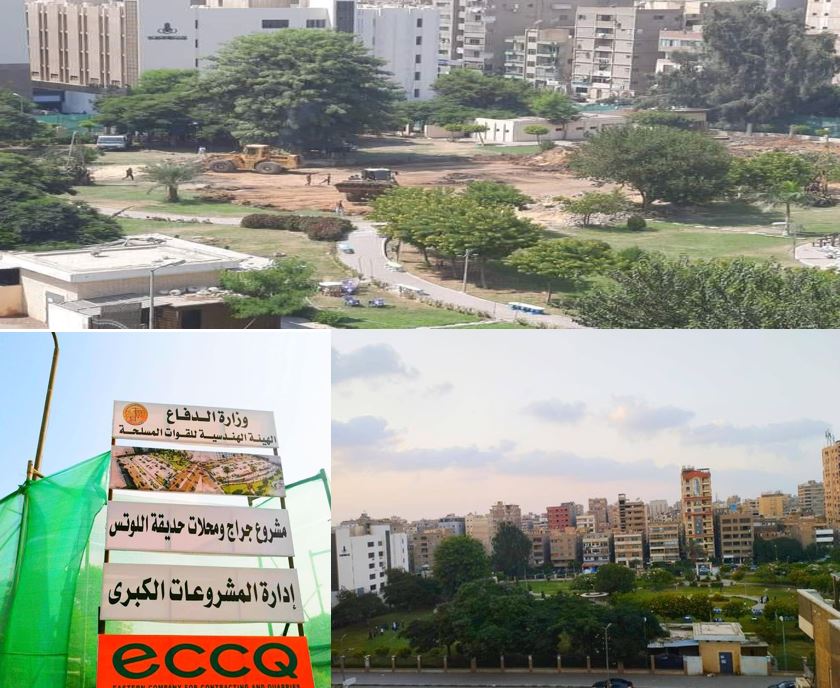 وأشاروا إلى أنه بعد إعلان الهيئة الهندسية للقوات المسلحة إقامة مشروع جراج ومحلات ، تداول الناشطون صورا على مواقع التواصل لتجريف وإزالة حديقة اللوتس.