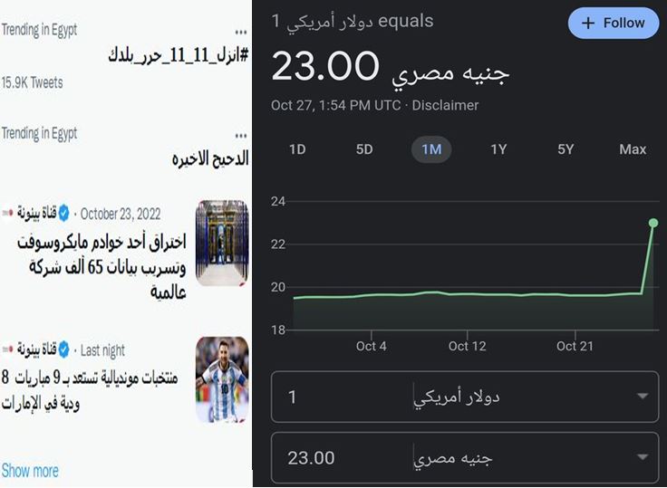 عقب قرارات البنك المركزي التي أصدرها صباح الخميس؛ تصدر هاشتاج #انزل_حرر_بلدك إلى جوار هاشتاجات (#الدولار) و(الجنيه المصري) و(الزنا الاقتصادي) بعد انهيار الجنيه إلى مستويات غير مسبوقة ووصل إلى نحو 25 جنيها في السوق السوداء متخطيا 23.14 للدولار الواحد في البنوك، وهو ما يعني كارثة محققة بعد أن حاول السيسي تسكين المصريين بقرارات مساء الأربعاء أبرزها رفع الحد الأدنى للأجور من 2700 إلى 3 آلاف جنيه، ورفع حد الإعفاء الضريبي من 24 ألفا إلى 30ألفا، وعدم زيادة أسعار الكهرباء حتى 30 يونيو، وعلاوة 300 جنيه لجميع الموظفين وأصحاب المعاشات.