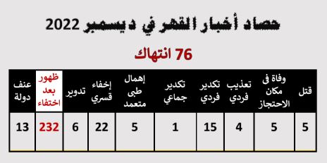 رصد "أرشيف حصاد القهر" لشهر ديسمبر الماضي 2022 الصادر عن "مركز النديم لمناهضة العنف والتعذيب" 76 انتهاكا متنوعا بينها 5 حالات وفاة داخل مقار الاحتجاز و5 حالة إهمال طبي داخل السجون و13 حالة عنف للدولة و5 حالات قتل.