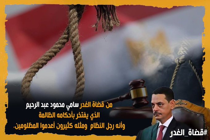 وكتب "من قضاة الغدر سامي محمود عبد الرحيم الذي يفتخر بأحكامه الظالمة وأنه رجل النظام ومثله كثيرون أعدموا المظلومين.
