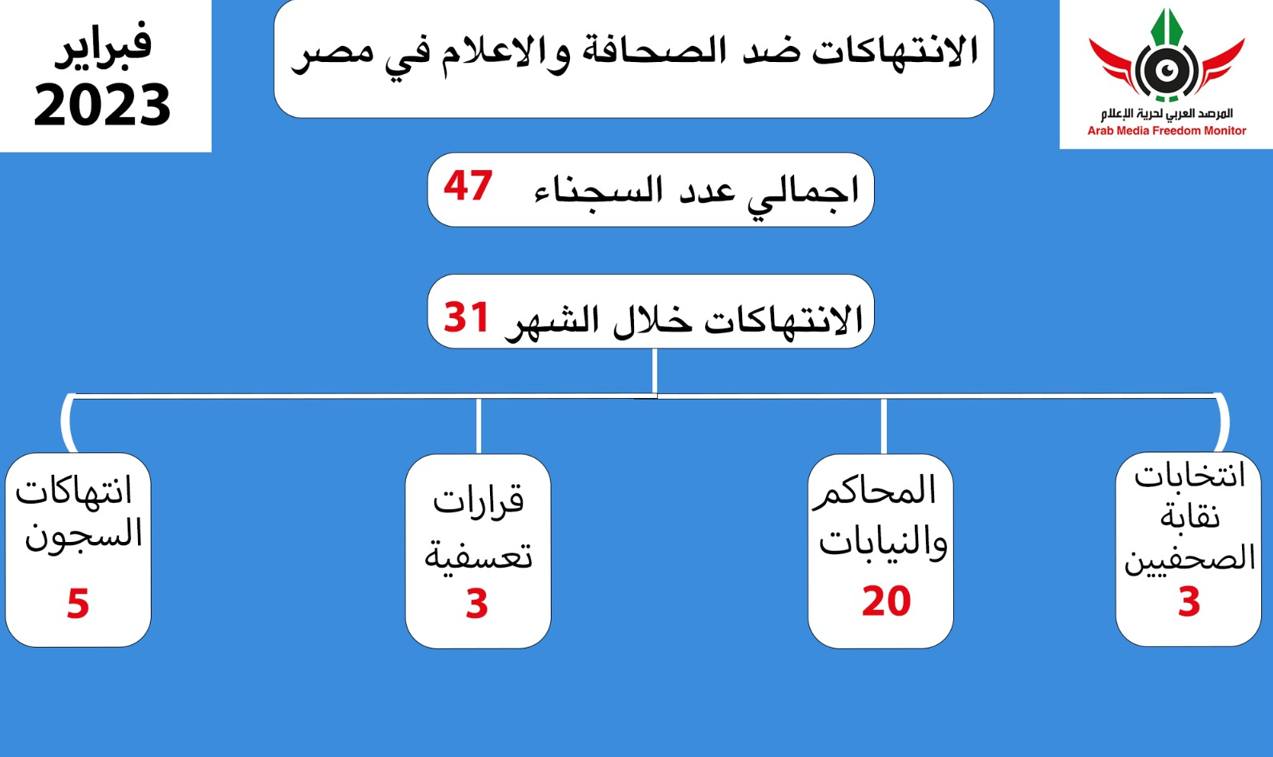 ورصد في تقريره عن انتهاكات حرية الإعلام في مصر لشهر فبراير المنصرم (31 انتهاكا ) تصدرها من حيث العدد انتهاكات المحاكم والنيابات ( 20 انتهاكا) ثم انتهاكات السجون ومقار الاحتجاز ( 5 انتهاكات) ثم قرارات إدارية تعسفية ( 3 انتهاكات) وهو نفس عدد انتهاكات انتخابات نقابة الصحفيين، فيما وصل عدد الصحفيين خلف القضبان بنهاية الشهر إلى 47 صحفيا وصحفية.
