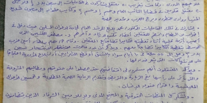 الرسالة المكتوبة بخط اليد والمصورة من أعلى (بطانية) قالت إن "عدد محاولات الانتحار بسجن بدر 3 وصل إلى 55 حالة في 10 أيام سواء بالشنق أو قطع الشرايين أو ابتلاع الأدوية احتجاجا على الانتهاكات التي يتعرضون لها".