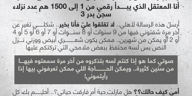 وقال صاحب الرسالة: "زوجتي الوفية كيف حالك؟ تركتك وفي رقبتك حمل كبير حمل الأولاد والمعيشة، أخبريني كيف تعيشين ومن أين تأكلين؟ أعرف أن غيابي عنك طال، كل هذه السنوات وأنا أحاول أعرف أي معلومة عنكم وأتذكركم في كل وقت، أعيش معكم حياتي التي سلبوها مني في العقرب ثم بدر 3 ".