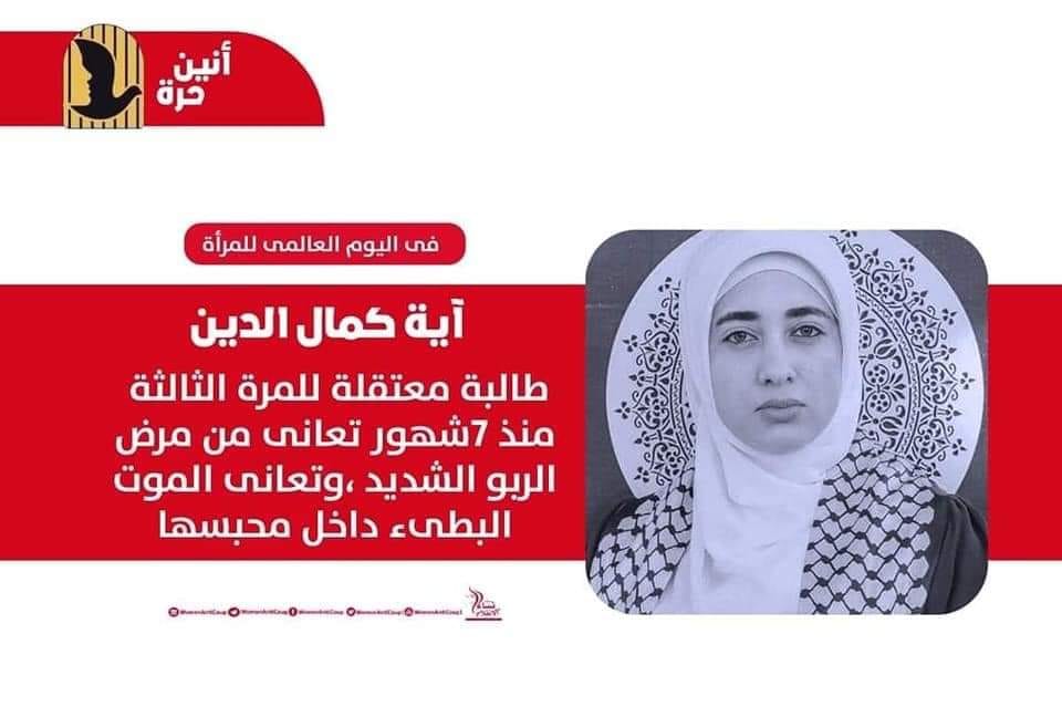 جددت حركة "نساء ضد الانقلاب" المطالبة بالحرية لـ" آية كمال الدين" البالغة من العمر 28 عاما، والمعتقلة للمرة الثالثة، وتقبع منذ يوليو 2022 في سجون السيسي على ذمة القضية رقم 93لسنة 2022 .