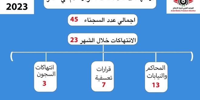 رصد المرصد العربي لحرية الإعلام (اكشف ) خلال تقريره عن انتهاكات حرية الإعلام في مصر لشهر مارس 2023 المنصرم 23 انتهاكا مع استمرار حبس 45 صحفيا وصحفية، بينهم 13 نقابيا، بعد الإفراج عن صحفيين اثنين.