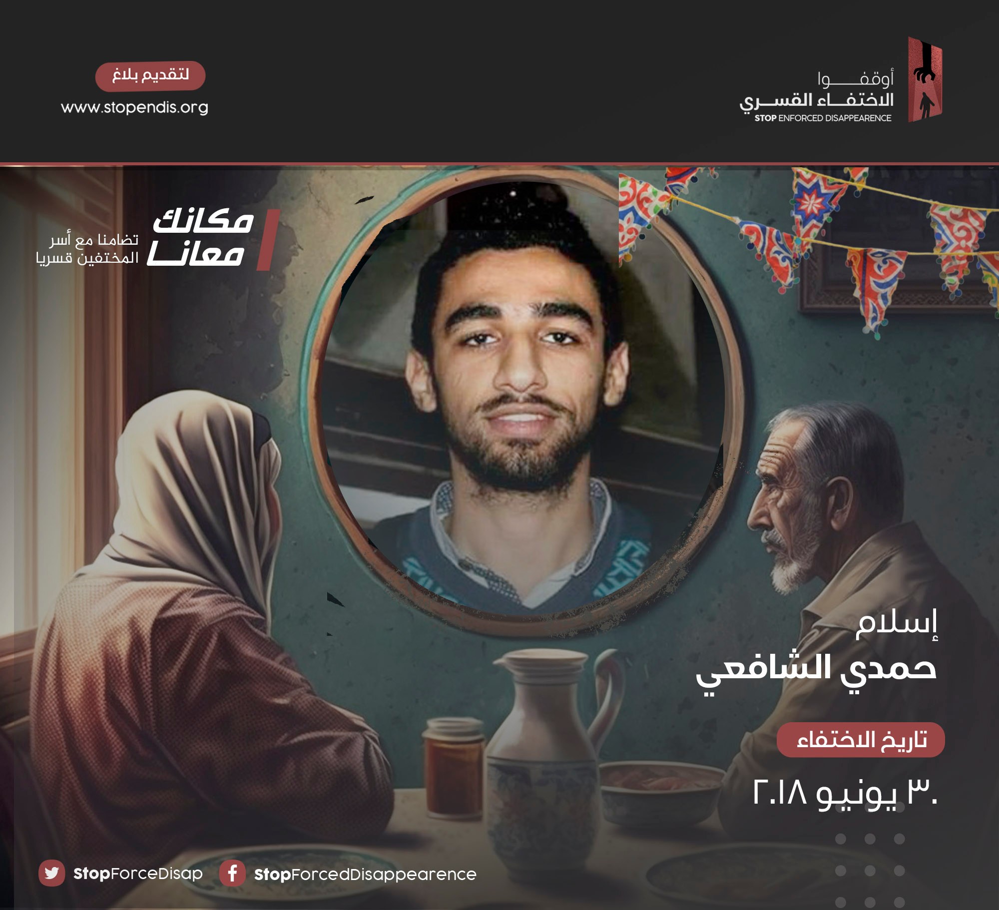 وقالت الحملة  “إسلام حمدي الشافعي”  خامس رمضان يعدي ومكانه لسه فاضي ، وتؤكد أسرته أنها اتخذت جميع الإجراءات الرسمية اللازمة، وقامت بتقديم البلاغات والتلغرافات للإفصاح عن مكانه، ولكن دون جدوى.