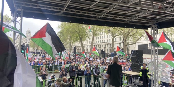 كما رفع مؤيدون لفلسطين أعلام فلسطين ولافتات مطالبة بتحريرها خلال  مسيرة  لإحياء ذكرى النكبة الخامسة والسبعين في مانشستر، بريطانيا.