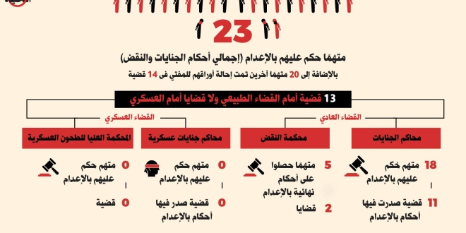 وذكرت أن أحكام الإعدام صدرت من محكمة الجنايات في 11 قضية شملت 18 شخصا ، يضاف إليهم 5 آخرين صدر ضدهم حكم بالإعدام من محكمة النقض في 2 من القضايا .