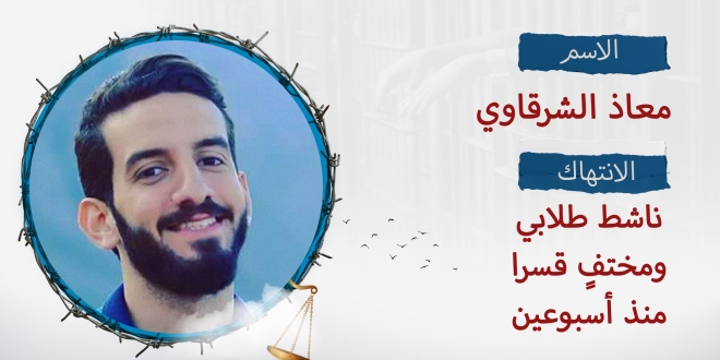 وفي سياق متصل طالب مركز الشهاب لحقوق الإنسان الكشف عن مكان احتجاز الناشط الطلابي السابق بجامعة طنطا ”معاذ الشرقاوي“ الذي تتواصل الجريمة ذاتها بحقه منذ نحو أسبوعين منذ اعتقاله من مقر إقامته في حي المقطم بالقاهرة في 11 مايو 2023.