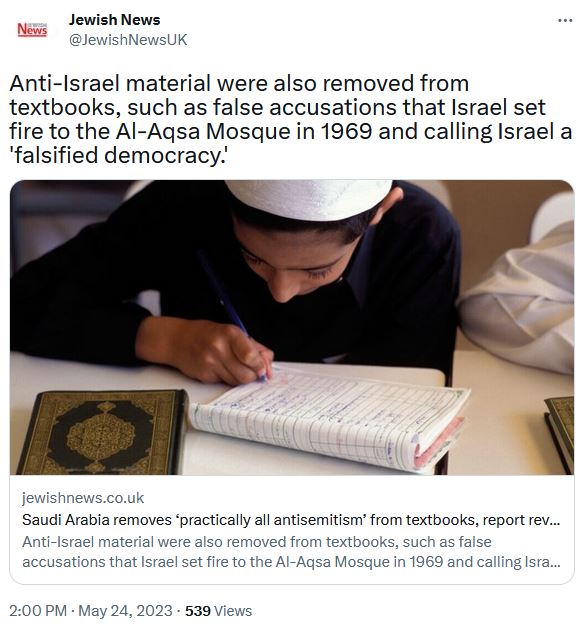 وتحت عنوان “المملكة العربية السعودية تزيل عمليا كل معاداة للسامية من الكتب المدرسية، زعم الموقع العبري أنه تمت إزالة المواد المعادية لإسرائيل من الكتب المدرسية ، مثل الاتهامات الكاذبة بأن إسرائيل أشعلت النار في المسجد الأقصى عام 1969 ووصف إسرائيل بأنها ديمقراطية مزورة.