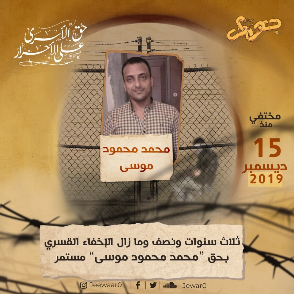 رصدت مؤسسة جوار الحقوقية استمرار جريمة الإخفاء القسري للمواطن "محمد محمود أحمد محمد موسى" وهو أبٌ لخمسة أطفال، للعام الرابع على التوالي منذ اعتقاله من أمام منزله بمحافظة الإسكندرية أثناء ذهابه لعمله الساعة الثامنة صباحا يوم 15 ديسمبر 2019 واقتياده لجهة غير معلومة حتى الآن .
