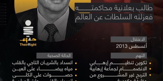 ومما يزيد من مخاوف أسرته على سلامة حياته أنه مريض بالسكر والكبد، وحالته الصحية تحتاج إلى رعاية متواصلة لا تتوافر في أماكن الاحتجاز سيىة السمعة، حيث لا شيء متوفر غير ظروف الاعتقال المزرية.