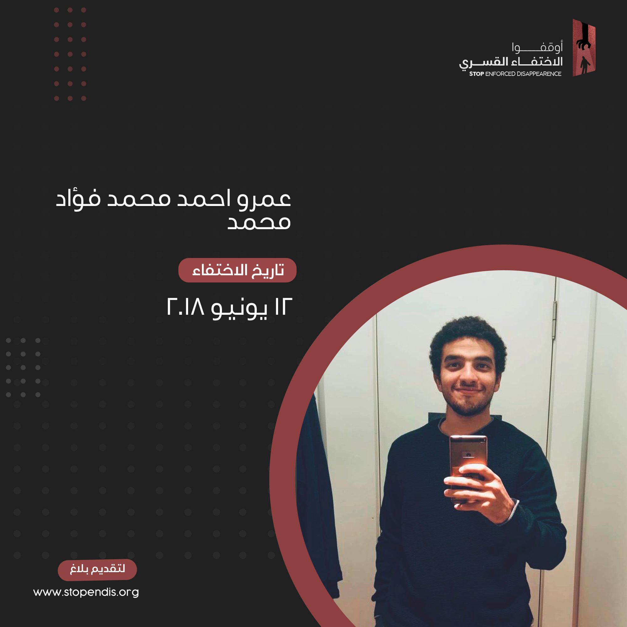 كما رصدت الحملة استمرار المصير المجهول ذات للشاب ” عمرو أحمد محمد فؤاد محمد “ويبلغ من العمر 27 عاما ويقيم بالهرم في الجيزة ويعمل بالتسويق والدعاية منذ أكثر من 5 أعوام  على التوالي ضمن مسلسل جرائم النظام الانقلابي ضد الإنسانية والتي لا تسقط بالتقادم .