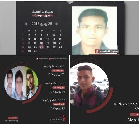 -"محمد بهاء إبراهيم محمود" يبلغ من العمر 23 عاما، طالب السنة الأخيرة كلية الهندسة، وكان يتلقى تدريبا تابعا للكلية في منطقة التجمع الخامس، وحاولت الأسرة التواصل معه في الساعة العاشرة مساء بتاريخ 28 يونيو2017 فوجدوا هاتفه مغلقا وانقطع التواصل من حينها.