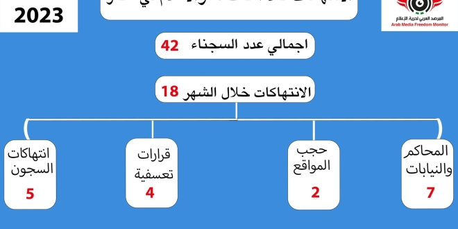 ووثق المرصد خلال شهر يونيو 2023 ، 18 انتهاكا، تصدرها انتهاكات المحاكم والنيابات “7” انتهاكات، وبلغت الانتهاكات بمقار الاحتجاز والسجون 5 انتهاكات، فيما أماكن رصد 4 انتهاكات في باب القرارات الإدارية التعسفية، مع انتهاكين في الحجب فضلا عن استمرار الحبس بنهاية الشهر المنصرم ل 42 صحفيا وصحفية، بينهم 11 نقابيا بجانب 5 صحفيات هن منال عجرمة، وصفاء الكوربيجي، وهالة فهمي، ودينا سمير، وعلياء عواد بعد الإفراج عن صحفي واحد فقط قبل عيد الأضحي وهو الكاتب الصحفي محمد مصطفى موسى.