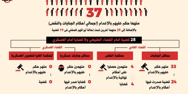 وذكرت أن أحكام الإعدام صدرت من محكمة الجنايات في 24 قضية شملت 33 شخصا ، يضاف إليهم 4 آخرين صدر ضدهم حكم بالإعدام من محكمة النقض في 4 قضايا.