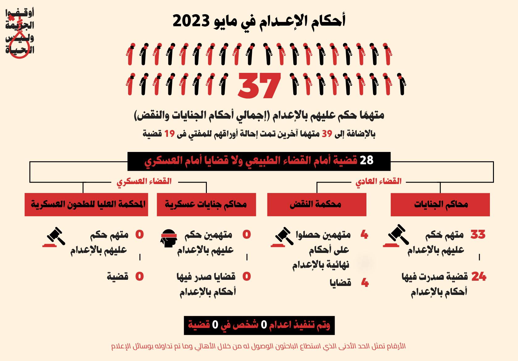 أصدرت المبادرة المصرية للحقوق الشخصية تقريرها الإحصائي الشهري ، بشأن عقوبة الإعدام في مصر، رصدت فيه صدور 37 حكما بالإعدام خلال مايو الماضي 2023 ، إضافة لإحالة أوراق 39 مواطنا في 19 قضية إلى مفتي العسكر تمهيدا للحكم بإعدامهم.