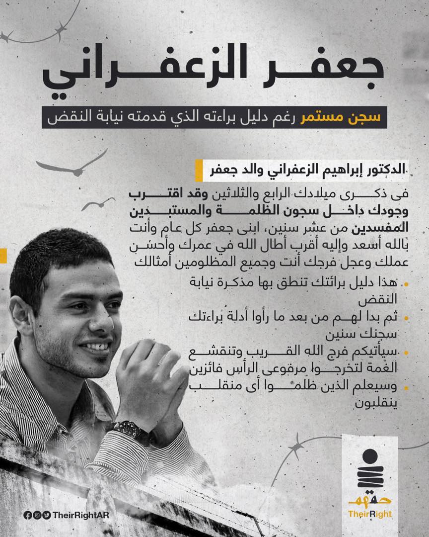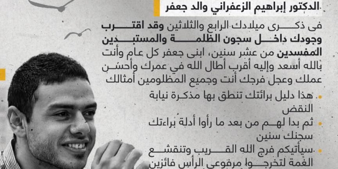 وكتب "الزعفراني" عبر حسابه على فيس بوك: "في ذكرى ميلادك الرابع والثلاثين، وقد اقترب وجودك داخل سجون الظلمة والمستبدين المفسدين من عشر سنين، ابني جعفر كل عام وأنت بالله أسعد وإليه أقرب، أطال الله في عمرك وأحسن عملك وعجل فرجك أنت وجميع المظلومين أمثالك".