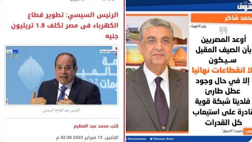 ولكن أمام تململ المصريين وعدت القناة استمرار الأزمة واستعانت بقول السيسي في المؤتمر الاقتصادي أكتوبر 2022: ” لولا حقل ظهر مصر كانت هتبقى مطفية، كنا هنجيب منين ١٠ مليار دولار نستورد غاز كل شهر، لذلك فتخفيف الأحمال هو أقل ضرر نتحمله خلال هذه الأيام بسبب موجة الحرارة التي نعيشها”.