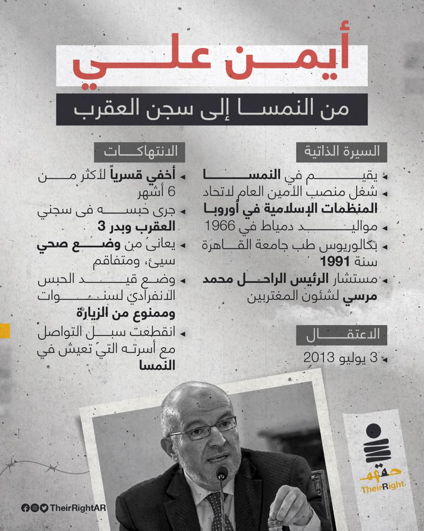 وقالت حقهم : “لا يعاني أيمن علي السجن والانتهاكات فحسب؛ ويزيد عليها انقطاع سبل التواصل مع زوجته وأبنائه في أوروبا على مدار عقد كامل”.