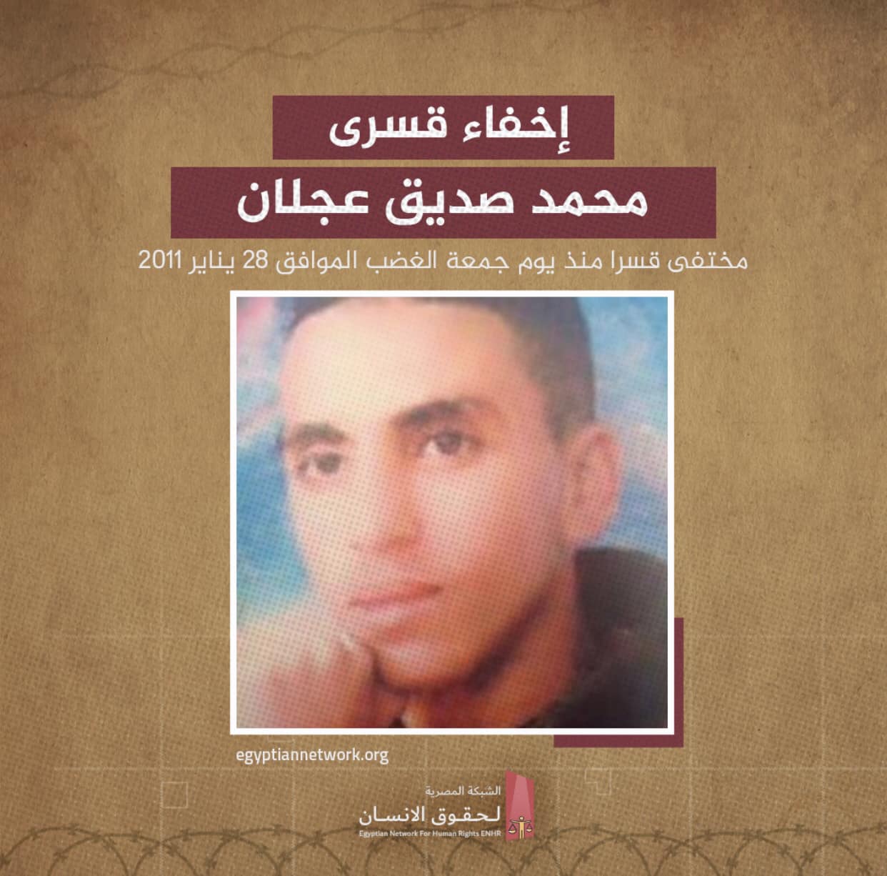 وطالبت الشبكة المصرية لحقوق الإنسان الجهات الأمنية، والنائب العام بالتدخل للإفصاح عن مكانه، والكشف عن مصيره؛ تخفيفا عن أسرته، وإيقاف معاناتها المستمرة منذ أكثر من 12 سنة من البحث المتواصل.