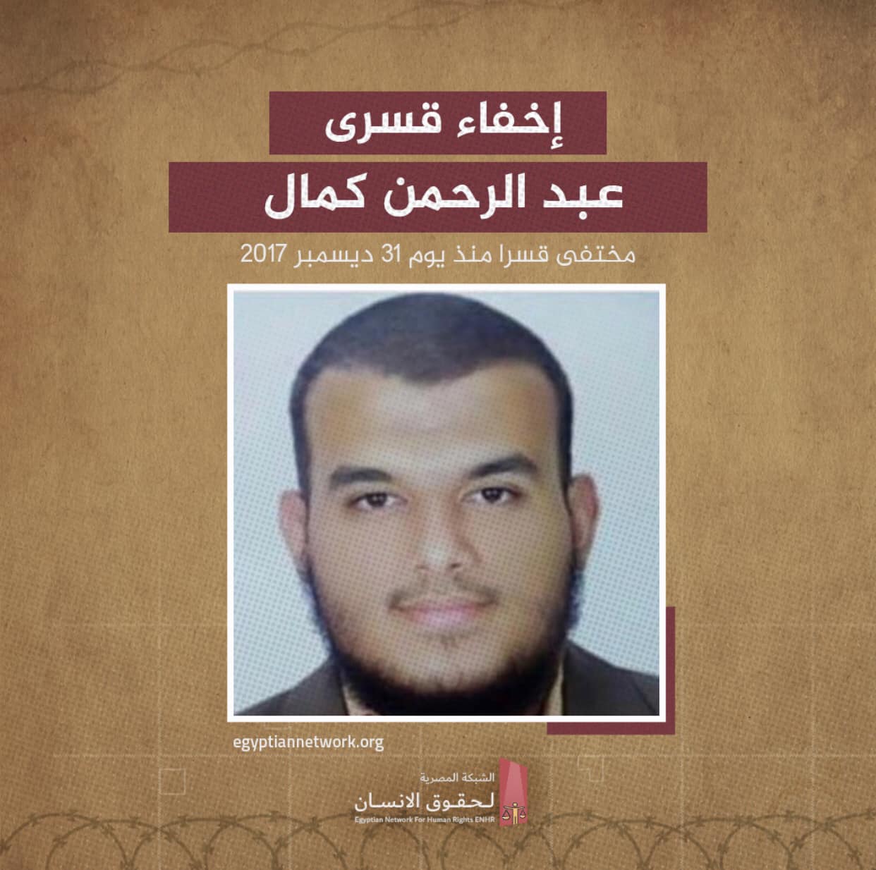 رصدت "الشبكة المصرية لحقوق الإنسان" استمرار جريمة إخفاء المعيد بهندسة القاهرة عبد الرحمن كمال محمود عمر قسرا من داخل قسم شرطة الجيزة ، منذ 31 ديسمبر 2017، لتنقطع أخباره منذ ذلك التاريخ.