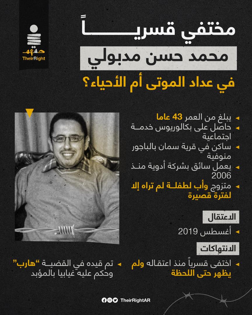 وتابعت بأن الضحية تعرض للإخفاء القسري، مع مدير وأفراد الشركة التي يعمل بها، والذين ظهروا أمام النيابة لاحقا، ووضعوا على ذمة إحدى القضايا، ثم حكم عليهم بالسجن؛ وعلى عكس زملائه، لم يظهر "مدبولي" حتى اللحظة، وجرى قيده في القضية كهارب، وحكم عليه غيابيا بالسجن المؤبد .