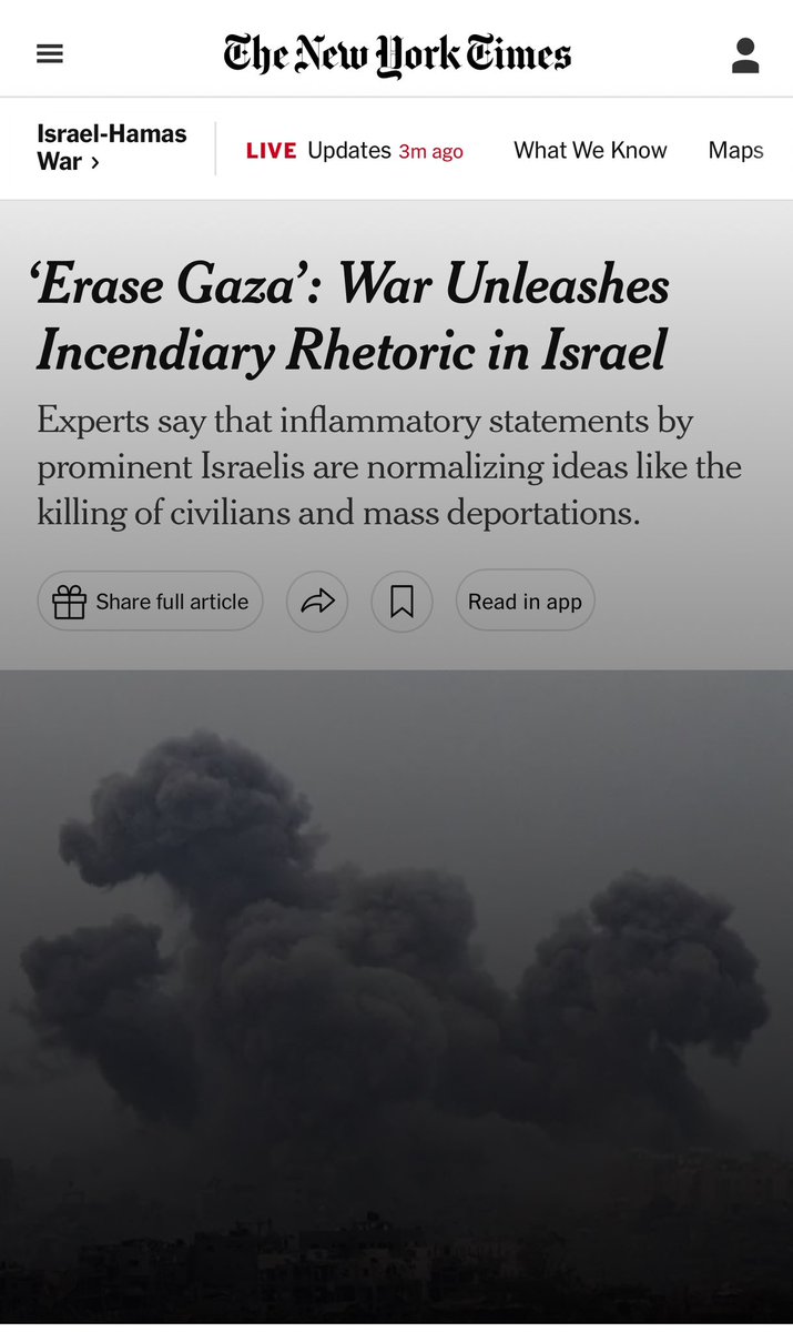 استعرضت صحيفة نيويورك تايمز الأمريكية جانبا مخففا من تصريحات قادة الكيان الصهيوني التحريضة على جرائم الإبادة الجماعية والهولوكوست الذي يمارسونه بحق البشر في قطاع غزة المحاصر.