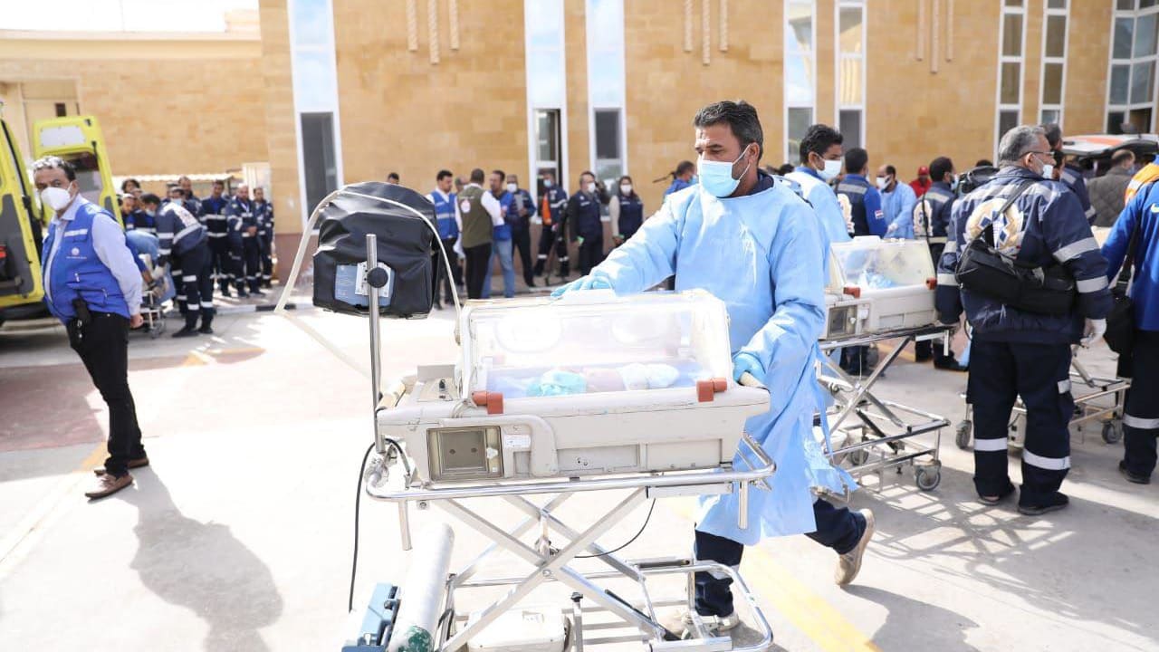 وأظهرت لقطات حية بثها تلفزيون القاهرة المصري الطاقم الطبي وهو يرفع الرضع بعناية من داخل سيارة إسعاف ويضعهم في حاضنات متنقلة، ثم يتم نقلها عبر موقف للسيارات باتجاه سيارات الإسعاف الأخرى.