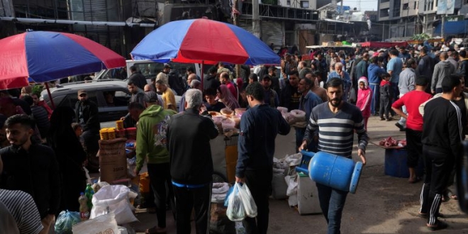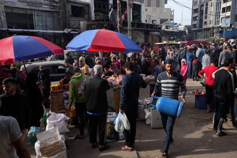 وشوهد آلاف الأشخاص يتزاحمون حول الأكشاك والمتاجر في سوق النصيرات في وسط قطاع غزة بحثا عن تأمين الإمدادات الغذائية التي تشتد الحاجة إليها. وفي جميع أنحاء قطاع غزة، وقف الناس في طوابير طويلة من أجل شراء القمح والمواد الأساسية الأخرى.