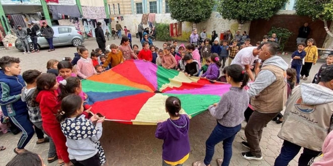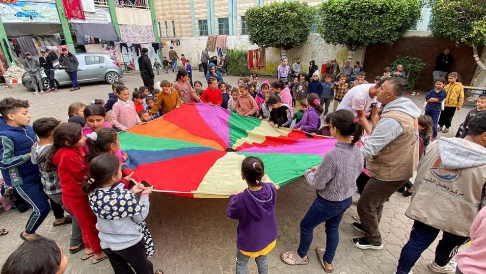 صفق أطفال نازحون من غزة وغنوا وقفزوا صعودا وهبوطا وهم يمسكون بمظلة عملاقة متعددة الألوان في لحظات نادرة من المرح، حيث أتاحت الهدنة بين دولة الاحتلال وحماس فرصة لمجموعة من الشبان للترفيه عنهم في فناء مدرسة، بحسب ما ذكرت وكالة رويترز.