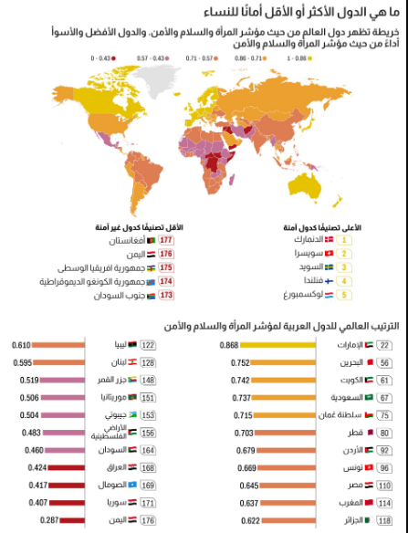 ويغطي مؤشر المرأة والسلام والأمن الصادر عن معهد جورج تاون للمرأة والسلام والأمن ومعهد أبحاث السلام في أوسلو 177 دولة واقتصادا بشأن وضع المرأة، ويستند المؤشر إلى تسجيل 13 مؤشرّا لوضع المرأة في الإدماج العدالة والأمن.