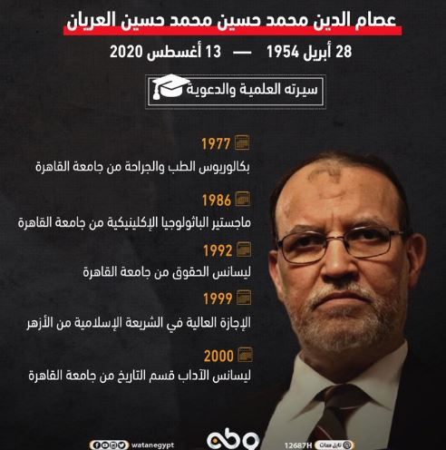 اما الصحفي الإعلامي قطب العربي @kotbelaraby فقال: “في مثل هذا اليوم (١٣ أغسطس٢٠٢٠) لفظ الدكتور عصام العريان أنفاسه الأخيرة في سجنه الظالم شديد الحراسة، مات غير مبدل ولا مفرط، مقدما نموذجا ملهما للأجيال في الصمود والتضحية، خسرت مصر بوفاته قائداً عاقلا منفتحا، جسرا للتواصل والحوار السياسي، مدركا لتعقيدات الأوضاع السياسية والاقتصادية والأمنية التي مرت بها مصر ولا تزال.