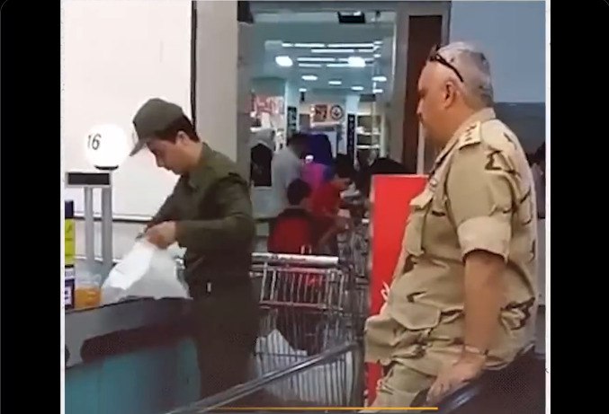 العسكرية المصرية الحديثة، يتركوا الحدود تقصف عند رفح ويقفوا في السوبر ماركت، ضابط في الجيش المصري برتبة عالية يستغل أحد المجندين في تعبئة مشترياته في السوبر ماركت”.