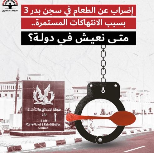 وقبل يومين، نشرت المفوضية تقرير عن سجناء مركز الإصلاح والتأهيل بدر 3 ودخولهم في إضراب جديد عن الطعام من أيام، ودا بسبب انتهاكات ما بين سوء المعاملة والتعنت مع الأهالي ورفض إدخال غالبية الزيارة خاصة الأكل.