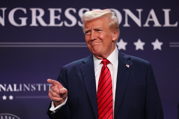 DORAL, FLORIDA - JANUARY 27: U.S. President Donald Trump acknowledges the crowd before addressing the 2025 Republican Issues Conference at the Trump National Doral Miami on January 27, 2025 in Doral, Florida. The three-day planning session was expected to lay out Trump's ambitious legislative agenda. (Photo by Joe Raedle/Getty Images)