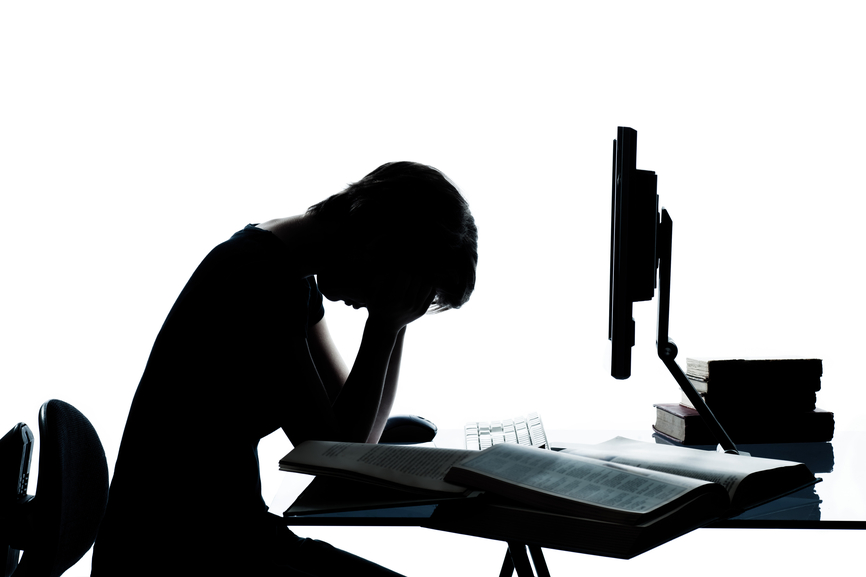 one caucasian young teenager silhouette boy or girl studying with computer computing laptop tired sad despair in studio cut out isolated on white background